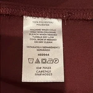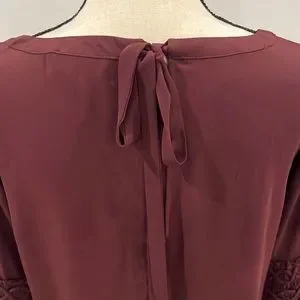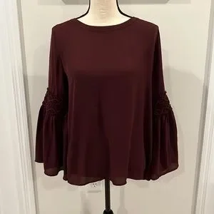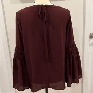 Pretty burgundy blouse with bell sleeves and back tie closure. Elastic detail at elbow makes for a flattering fit. Worn once. Perfect condition.
