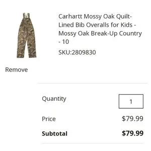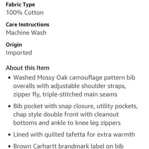 Ideal for frosty-morning chores or colder hunts, perfect for fishing or camping. Carhartt® Mossy Oak® Quilt-Lined Bib Overalls for Kids have all the features you expect in adult Carhartt work clothes. From their adjustable straps, snap bib pocket, and zip fly to their double-front, chap-style legs with cleanup bottoms and knee-high leg zips