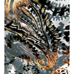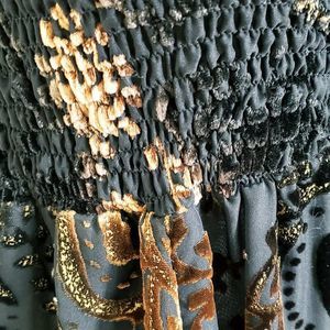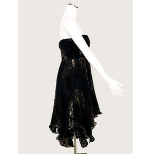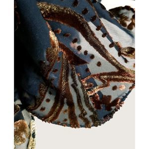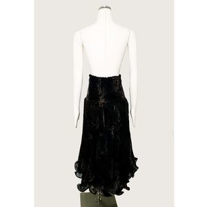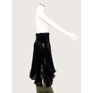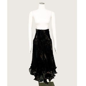 Burnout Crinoline Dress/Skirt. 100% Viscose. Measurements: Across top lying flat 12"/Length at longest point 38". Velvet appliques throughout. There is a built in lining with an additional layer of crinoline. This is a handmade item and has no size or brand. There is a lot of flexibility in sizing due to elastic puckering. Can be worn as a dress or a skirt. This is in perfect condition. It's a one of a kind and truly magnificent!