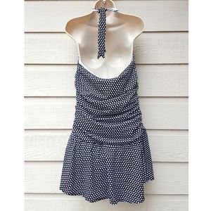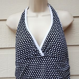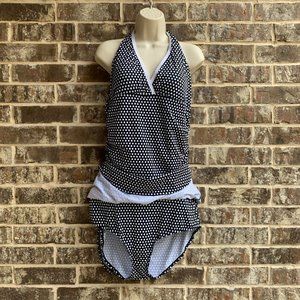Jaclyn Smith Women’s One Piece Halter Swimsuit Skirted Black White Polka Dot