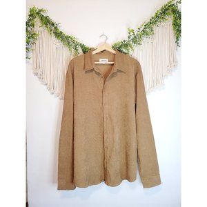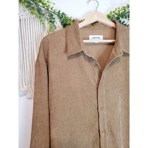 Features: common market brown button up shirt, micro corduroy, long sleeve, collared, longer length, lightweight