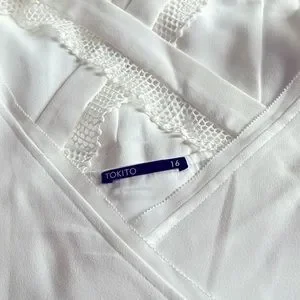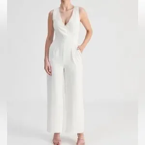 New and unworn, this TOKITO ivory white jumpsuit in size 16 exudes elegance. The jumpsuit features delicate mesh lace accents, a convenient side zip, and pockets for added functionality. Its relaxed fit offers both comfort and style, while the polyester crepe fabric ensures a sophisticated look. The entire piece is fully lined with satin for a luxurious finish.