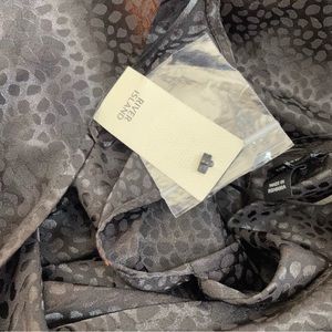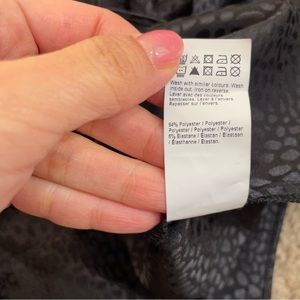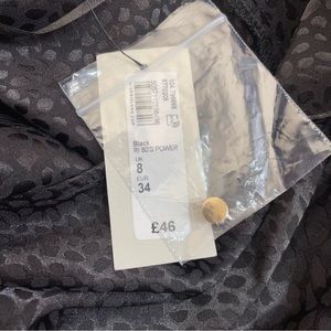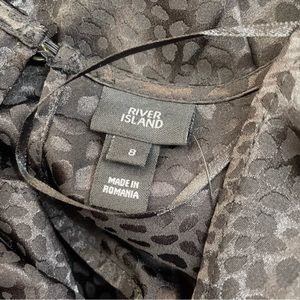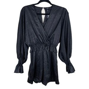 New with tag River Island Long Sleeve Jacquard Shirred Romper in black. Size 8. V-neck, wrap design, elasticized waist, frills on cuffs and waist. Pit to pit 16.5, waist 12, length 31.5