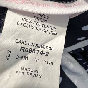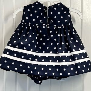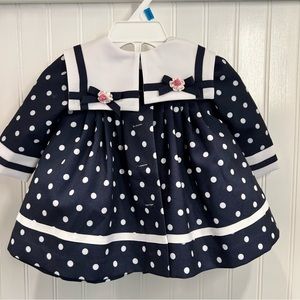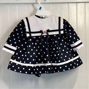 3-6mo 4pc precious set for any outing. Excellent used condition. Includes pink rosette on white collar and navy/white polka dot jacket, matching polka dot dress with pantaloons, and white brimmed, rosette hat.