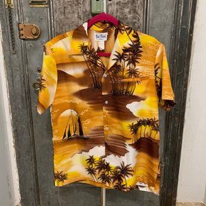 Medium Vintage 60s Rai Nani Hawaian Shirt with sailboat and palm trees collared