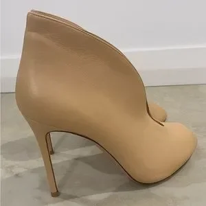 Created in ultra soft tan nappa leather, the Vamp has a distinctive design that combines the sleek lines of a meticulously crafted ankle boot with a deliciously seductive deep front cut out and peep toe. Embellished with a slender, straight, 105mm heel these shoes will add a touch of rock chic to any wardrobe.