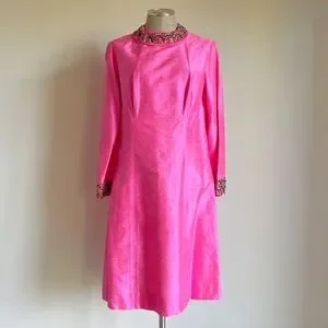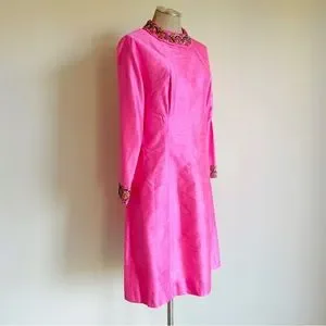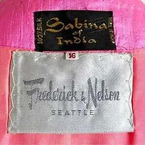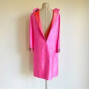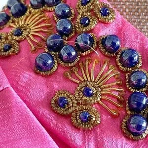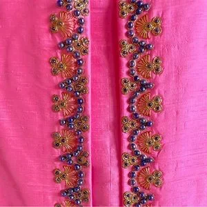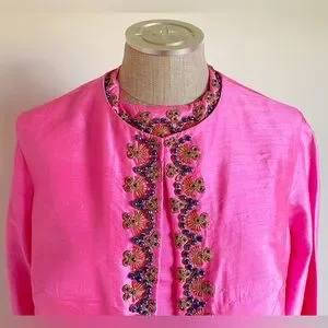 Shot silk with colorful gold and deep blue embellishment around the collar, cuffs, and front opening