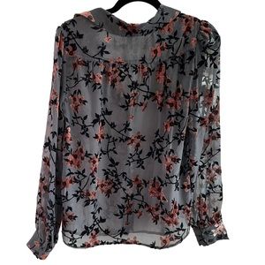 Gray Cherry Blossom Sheer Velvet Puff-Sleeve Button Down Blouse