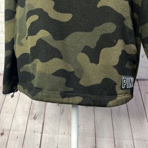VS Pink Camo Fleece Lined Quarter Zip Pullover Sweatshirt. Great condition. Bungee at bottom- can be worn loose and longer or cinched up and cropped. Kangaroo pocket. Logo on lower front hip. Stretchy and soft. Normal wash wear. Oversized fit.