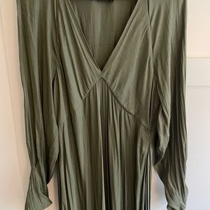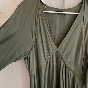 I love this dress and I’ve never worn it but it looks great on. I just ended up going with a different holiday dress and need to make space in my closet. 100% polyester. Front is a slight high-low. Sleeves are a beautiful shape and structure, almost Victorian in the way that a puff sleeve upper is sewn down to a wrist that hugs.