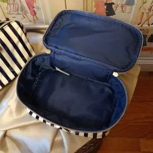 This two piece cosmetic bag set is so pretty. They are navy striped on a white sparkle background. Each is accented with gold dots and bows.