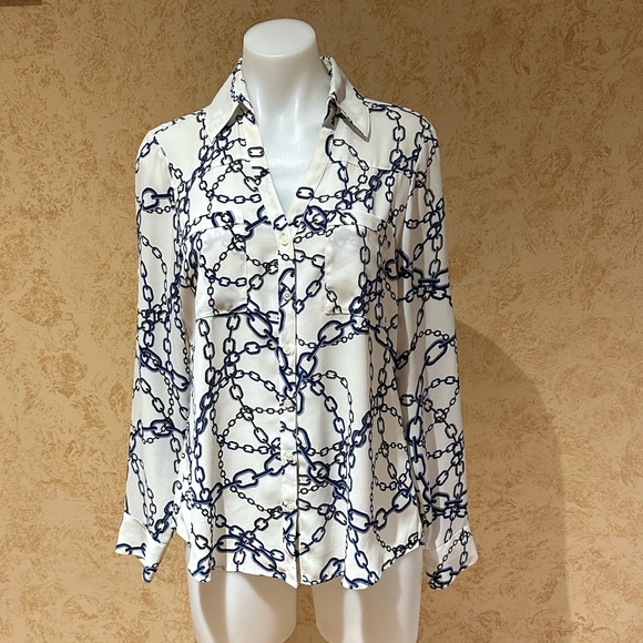 Excellent condition- Express - The Portofino Shirt- Chain link design w/Blue color chain link detail on a light Cream color blouse, V style neck with collar, Long Sleeve, button down w/2 front pockets. Very classy & iconic look!