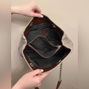 Tan and black patent leather Kate Spade shoulder bag! 2 toned exterior, with a medium tan color offset with black. Gold hardware detailing, including shoulder straps with chains. 4 studded feet on the bottom. Black and white polka dot interior, with center, zipped compartment, side interior zipper pocket, and 2 additional side pockets.