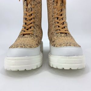 These NWOT combat style boots from Free People feature a hiker inspired design, floral patterned canvas fabric uppers, leather accents, front lace-up closure, inside zipper closure, a white chunky lug sole, a round toe, a pull loop at the back of the heel, and durable tread on the soles.