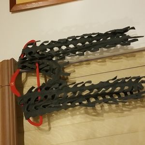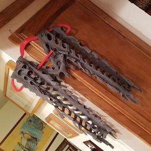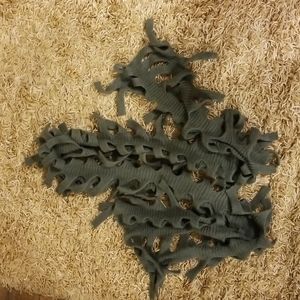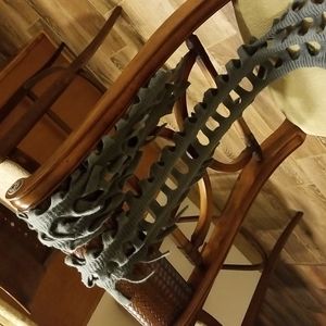 You can be warm and stylish with this amazing knit scarf. The scarf measures 68" long. It can wrap around your neck or collar several times. It has an open weave pattern with fringe accents. There is so much you can do with this scarf with just a little imagination. This is a real unique item. A unisex item.