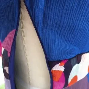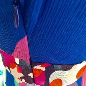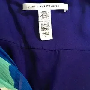 DVF Designer Silk Chiffon Crinkled, Vibrant, Multi-color Floral Printed below the knee dance dress, measures 44" long from high point shoulder. Flattering, Off-the-shoulder, V-neck with soft, Petal Sleeves. Very full ruffles elegantly flutter in motion. Fully lined in rich blue-violet in silk blend with stretch for free movement. Side zip. Good Pre-loved condition with slight snags, as pictured.