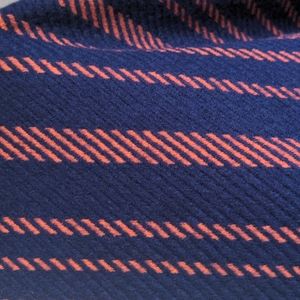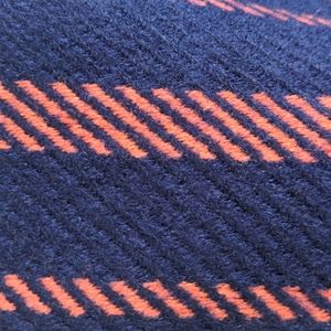 Soft fabric with a navy and orange striped pattern will keep you warm and stylish! Fringe on the hem. Approximately 33" on the back hem, 40" on the longer sides. This cape / poncho is like a warm blanket!
