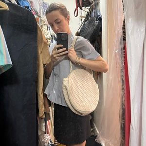 An oversized format of the round bag, with two braided shoulder straps for all-day wearability. Take the Emilia anywhere and make a subtle, vintage style statement. Browse vinyls at your favorite record shop, catch up with a friend over red wine in the warm glow of late afternoon, but be prepared to be asked, "Where did you get that beautiful vintage bag?"