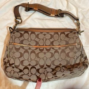 Coach shoulder bag. monogram, brown suede, gold leather, brass metal