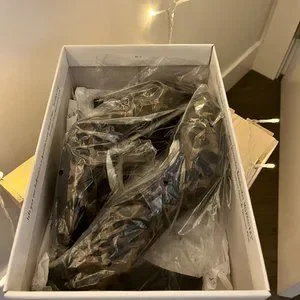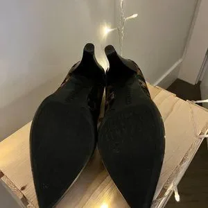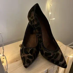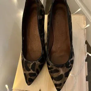 These are hard to find, made in Spain, high quality shoes with a soft rubber sole. Styling includes scalloped edges, leather piping, pointed toes, soft leather soles and a darker print than the average leopard print heel. Always wrapped and kept in the box. They will arrive to your door like new. My heel height is lowering as I age and these heels are too good to be sitting in a closet and not seen. Euro size 38.5 - US8