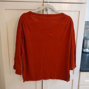 beautiful three season, scoop neck, light weight sweater. great with denim or white jeans. pretty details at hem and sleeve! trendy rust and olive colors.