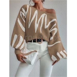 Knit Graphic Pullover Sweater Off White Tan Camel Bishop Sleeve