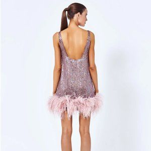 The slinky scoop neck relaxed fit dress has a voluminous feather trim that will have you party ready.