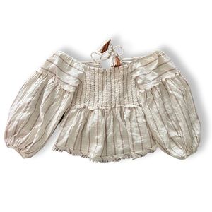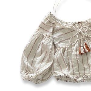 Sweet and striped top in a V-neck silhouette with drawstring tie and exaggerated puff sleeves in a babydoll-inspired silhouette. •Raw bottom hem •Ruched elastic back •Rounded bottom hem