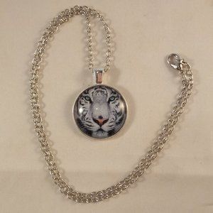 Beautifully crafted mystical white tiger pendant cabochon chain necklace silver plated alloy. Top quality, high polished shine, brand new, never been worn. Lead, nickel free. This necklace sparkles.