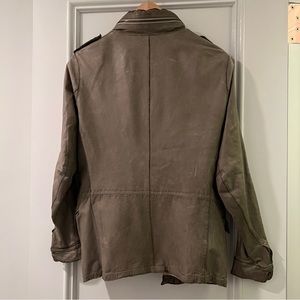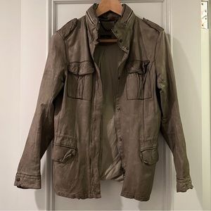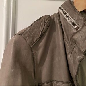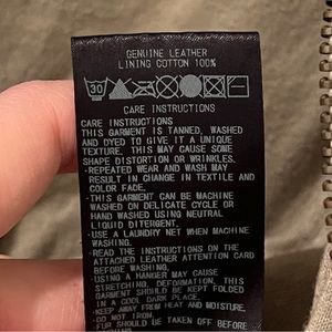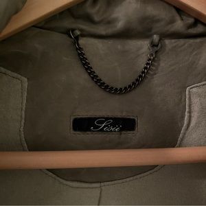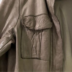This super soft washable leather in a cool military style. Jacket has a zipper and a built-in hood that can be rolled into the collar or pulled out. Great muted army green.