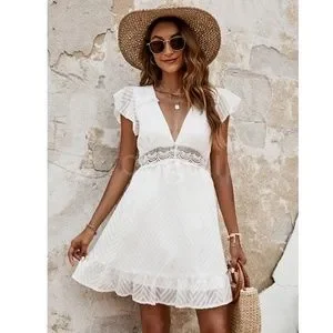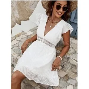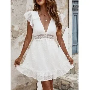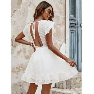 White Backless Ruffle Detail Summer Dress Short Mini V-Neck Crochet