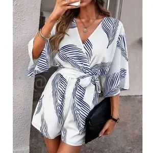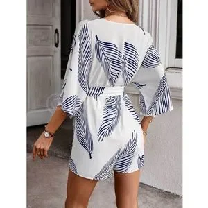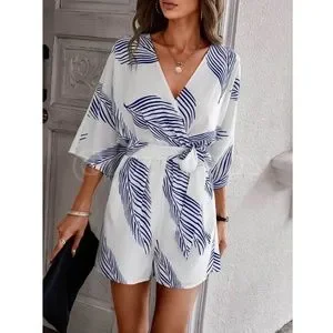 Leaf Tropical Print Blue on White Romper Belted V-Neck