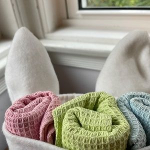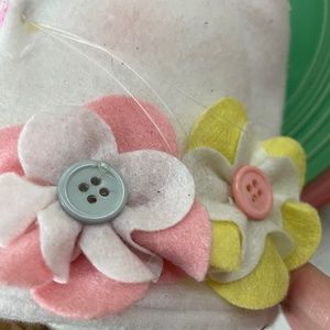 This soft white bunny is actually a towel holder that includes 3 pastel waffle weave cotton kitchen towels (in pale blue, pink and green). The holder stands 12" tall. The bunny has whiskers, a cute beaded bow and felt flower and button accents in spring colors. The holder is in great shape, and the towels have never been used. Makes a great spring decor accent in either a kitchen or bathroom!