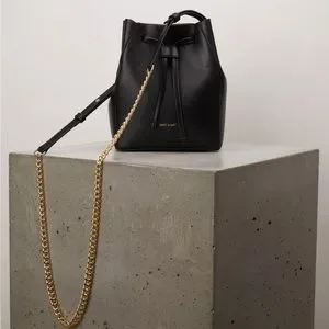 Bucket bag with drawstring closure and a chain crossbody strap.