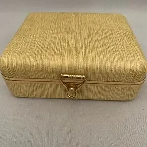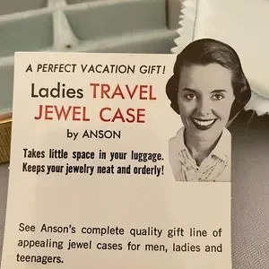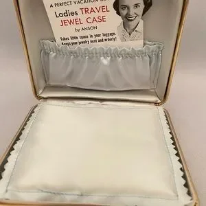 This vintage Anson travel jewelry case is in like new condition. It appears to have never been used. There is an original card inside describing the case. The outside is gold faux leather with a gold tone latch. The interior has silver satin lining and a pocket on the lid and five silver velvet lined compartments on the base. It is small measuring 4 1/4” x 3 3/4” x 1 1/2”. In excellent condition.