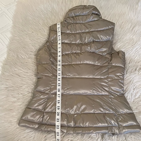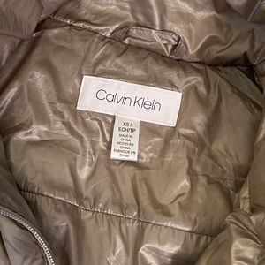 Gold Calvin Klein puff vest that is super cute and fine quality made. It also pairs with a lot of options making it quite the versatile piece. Great used shape and coming from a smoke free environment. Zippered, usable front pockets. Golden headwear. Please note that there are several tiny pin holes (hardly noticeable) that are there due to my pinning the collar down. These can really only be found upon diligent searching so they will not be noticeable when worn. Just know that they are there. Please refer to all of the photos provided before purchase to be sure of the details, condition and measurements. Note: the first two pics are stock of the same or very similar vest and last couple are of the pin holes. Thanks for looking!