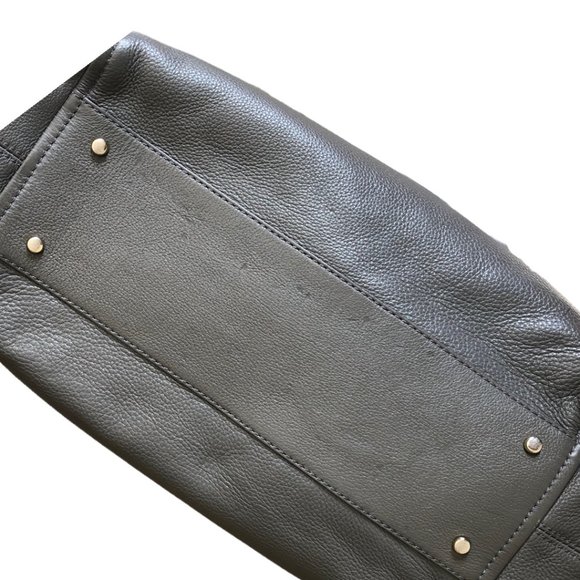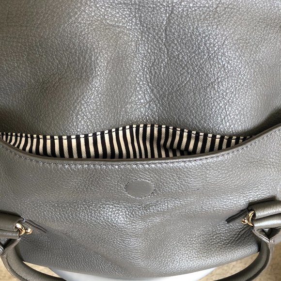 FEATURES: Soft pebbled cowhide leather / short shoulder handle / secure 15" zippered dome with flap closure / striped nylon lining / gold-tone hardware.