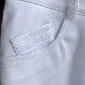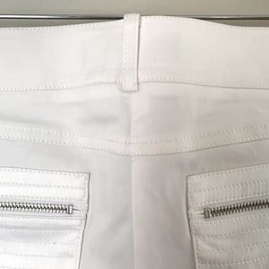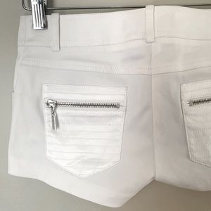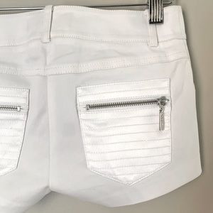 Guess by Marciano size 00 white low rise short with silver hardware, front coin & back pockets made of shiny fabric, detailed stitching on pockets, button has minor scratch, see photo, NWT