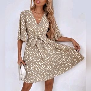 New Boho Short Flutter Sleeve Wrap Front Dress Belted Tan White