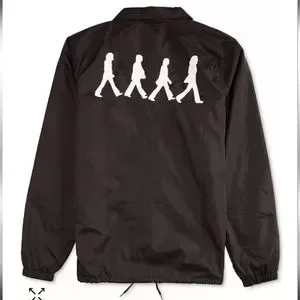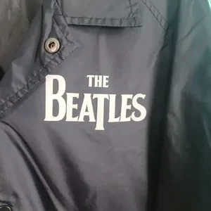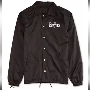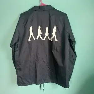 The Beatles Coach Windbreaker Jacket, Snap Button Closure, Cinched Adjustable Waist, The Beatles printed on Front Left Chest, Abbey Road Silhouette on Back, Size Medium