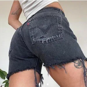 100% cotton high rise black wash shorts!! i hand distressed these baddies myself! one of a kind :-) love em long like mom shorts or rolled up n cuffed shorter! a little stretch!