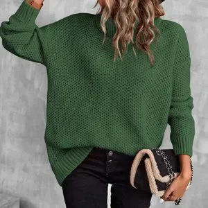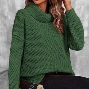 Green Preppy Womens Turtleneck Drop Shoulder Pointelle Knit Sweater
