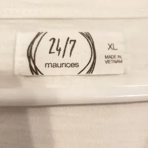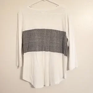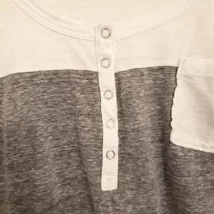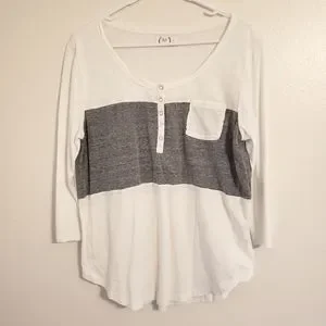 Womens size XL. White shirt with gray stripe and snap detail. 3/4 Length Sleeve.