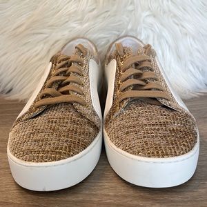 - gorgeous tweed in gold and beige with classic white leather