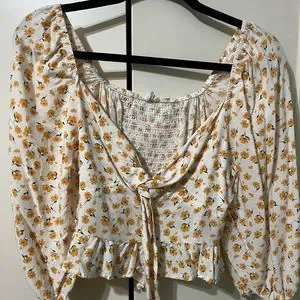 This is a gently used women’s crop top from Macy’s. It is white with flower detailing. It is long sleeves and flowy and it is a size large. If you have any questions please let me know :) and please feel free to send offers!