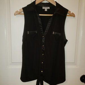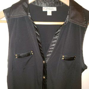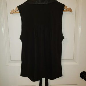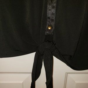 tie waist, silky black trim on each pocket, collar, down the front....looks like leather