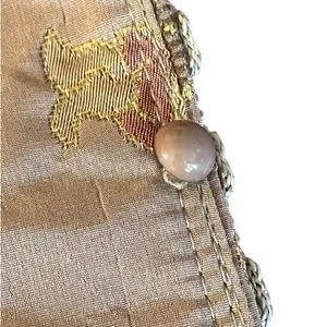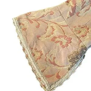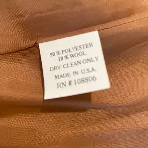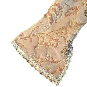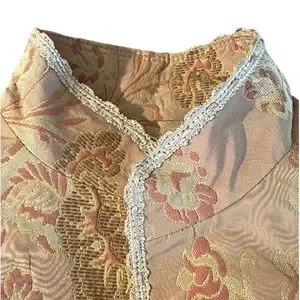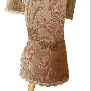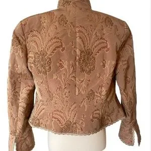Featuring a stunning jacquard blazer with a floral motif and bell sleeves. It has a stand-up collar, lace trim and hidden pearl buttons for closure. Fabric is a tan-orange color with orange motifs, and has a subtle sheen. The blazer is structured and has shoulder pads, providing a flattering silhouette. Picture this unique blazer/jacket dressed up or down with jeans!
