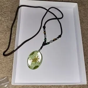 It's a very nice piece with 2 sides and 2 different colors. The flowers you can see inside the charm are real. Sealed in preserved. The beads on the string are actual jade. Beautiful outfit extra. 30" .