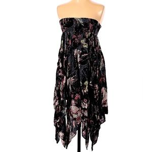 This Boho black floral skirt from free people is knee length and features a strapless neckline with fringe+frayed accents and frayed edges. 100% Rayon