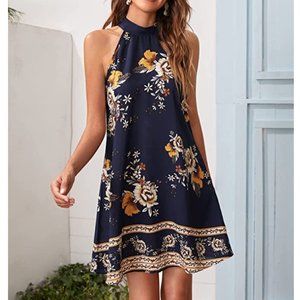 Navy Blue Floral Printed Chiffon A-Line Halter Sleeveless Mini Shift Dress